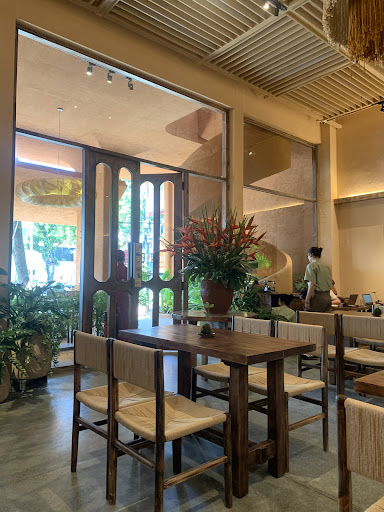 Designed by the architectural firm 3fconcept, Thìlà Café draws inspiration from the historic nha ruong houses of Hue and the narrow tube houses of Hoi An. The interior features handcrafted elements, including walls finished with a straw-infused plaster, wooden furniture with woven paper accents, and lighting made from giấy dó, a traditional Vietnamese handmade paper. A central skylight and indoor garden with shade-loving plants like ferns and moss introduce natural light and greenery, creating a serene and inviting atmosphere .