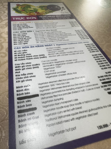 For some unknown reason this place was recommended on culture trip and by the hostel we’re staying at for a great and cheap vegetarian eat. We went there for a light dinner and were sat on a dirty table with a used water cup that the waiter flipped back upside down onto the “clean” cup tray and proceeded to stand there silent and pointing at the menu until we ordered, which was very uncomfortable and already paving the way for a horrible experience. We had to use google translate to tell the waiter that we would take some time to chose our meals and then he finally moved from over the top of us. We ordered the pyramid rice dumpling, and the fried rice pancakes which state on the menu they come out with 2. A bowl of Pho and a noodle soup dish. The meals came out concerningly fast and they gave us a plate (approx 5) of the dumplings. We ate our meals and all’s well and good. We count up how much it should be according to the menu (55,000) but when I handed her the money she brought over a written down receipt charging us for each dumpling individually and the 2 rice pancakes individually so double what was stated on the menu. Not clearly stating on the menu anywhere the quantities they will bring out or how much it actually costs it was a complete scam and none of them speak English to discuss what was going on. This whole experience was infuriating and they knew exactly why we were angry but knew we couldn’t do anything about it. Avoid at ALL COSTS it’s not worth it....