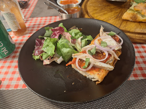 Pizza half-half: nửa cá hồi xông khói béo mà vẫn thanh, mùi xông khói cá, khoai tây, sốt rau hoà quyện; nửa kia là 4 loại phô mai, vị mặn - béo - thơm đan xen, kéo sợi “chảy dài”, có bluecheeese ăn kèm mật ong. Và phải nói riêng về đế bánh: giòn rụm ở viền, đế bánh đủ để giữ phần topping cheese và ủ đủ giòn xốp mềm mại bên trong.