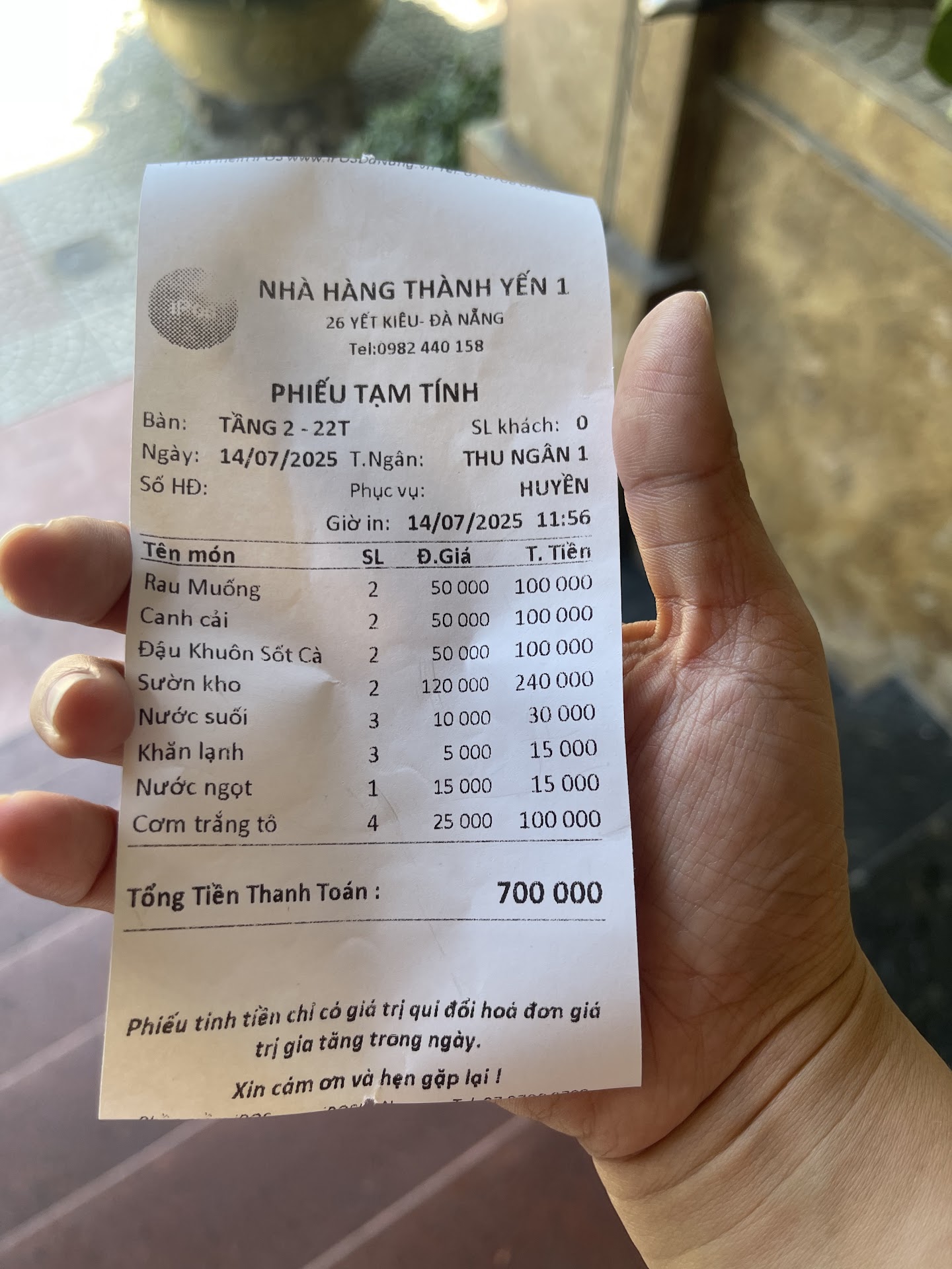 Read moreHôm nay gia đình tôi ăn trưa tại nhà hàng Yến Thành. Sau chuyến xuyên Việt 27 ngày, tôi thực sự muốn ăn bữa cơm bình thường như ở nhà. Chúng tôi ghé quán này ăn cơm. Món sườn kho nước dừa rất thơm ngon, cơm dẻo ngon lắm. Gia đình tôi 10 người: 5 người lớn và 5 trẻ con, ăn hết 700k. Ngon...