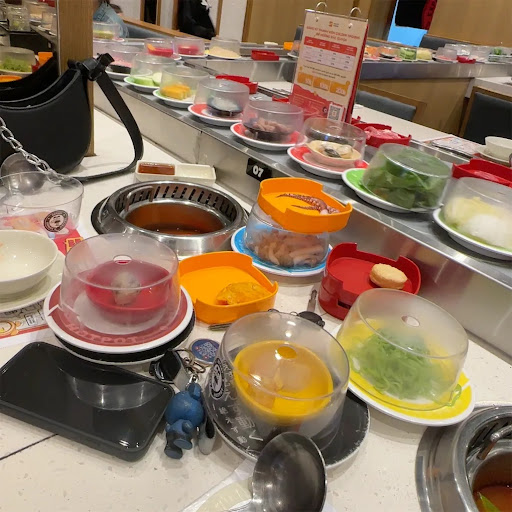 Ngay khi bước vào quán, tôi đã bị thu hút bởi không gian hiện đại, sạch sẽ và thiết kế cực kỳ bắt mắt. Những dãy bàn được sắp xếp gọn gàng chạy dọc theo hệ thống băng chuyền, nơi các món ăn tươi ngon liên tục di chuyển qua trước mắt thực khách. Không cần phải gọi món, tôi chỉ cần ngồi một chỗ, chọn món mình thích ngay trên băng chuyền cảm giác vừa thú vị vừa tiện lợi vô cùng.