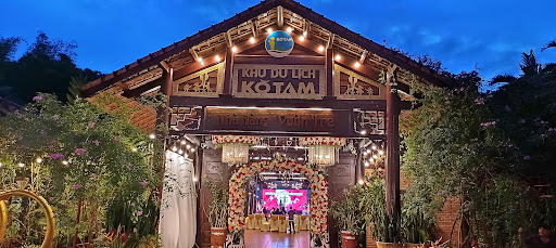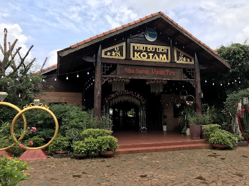 Nhà hàng làm bằng gỗ là chủ yếu có sân khấu để tổ chức giao lưu văn nghệ Mái ngói ẩn hiện dưới những tán cây cận kề là quán cà phê , khi vô cổng mọi người giữ vé và đến đây để uống cà phê...