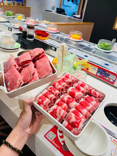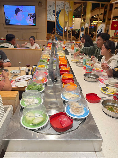 Một băng tải rất lớn chạy quanh nhà hàng, sức chứa ở đây tôi nghĩ rơi vào khoảng 150 người. Mất khoảng 4 phút để mọi thứ trở về vị trí ban đầu. Thực phẩm rất đa dạng gồm thịt bò và thịt lợn, cá, bạch tuộc, mực, và rau, chủ yếu là rau xanh nhưng cũng có một số bắp, và nhiều loại khác.