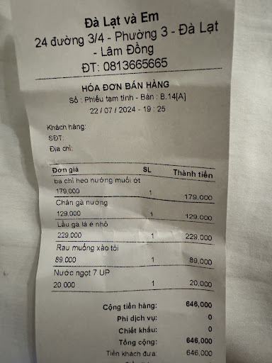 The service at the restaurant was extremely slow. I don't know if they disliked our family or what, but it seemed like they only served other tables, leaving ours for last. When we arrived, there were only three tables, but even when the restaurant had over ten tables, we were still the last ones to get our food. The restaurant has paper menus for ordering, and I clearly wrote our order in Vietnamese, but they still missed the Thai hot pot. The food was not any better than other restaurants and not cheaper either. Although there was live singing, the sound quality was poor and just noisy. In summary, my family was very disappointed and will not be returning, even though we had visited four times before because it's near the hotel we usually stay at, and we don't have high expectations for prices or...