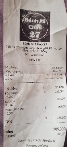 Giá cả hợp lý Giá cả tại Bánh mì chảo 27 được đánh giá là phải chăng, phù hợp với chất lượng và khẩu phần ăn. Một phần bánh mì chảo dao động từ 30.000 - 50.000 VND, tùy theo loại và nguyên liệu đi kèm. Đây là mức giá khá hợp lý so với các quán ăn khác tại Đà Lạt.