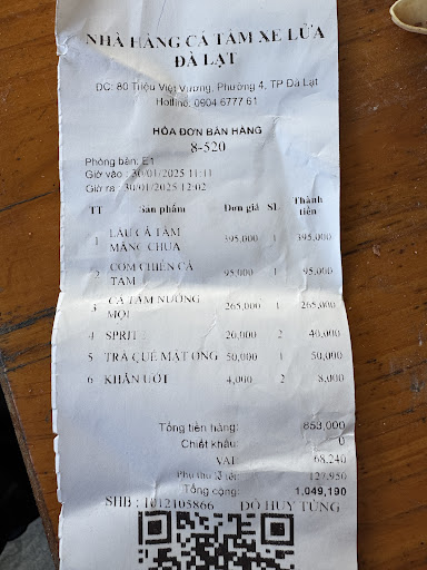 I recently dined at NHÀ HÀNG CÁ TẦM XE LỮA and while the food was enjoyable, I left feeling quite disappointed overall. We tried a few dishes including LÂU CÁ TẢM MĂNC CHUA, CƠM CHIÊN CÁ TAM, and CÁ TẨM NƯỚNG MỌI, and I must say the flavors were pretty good.