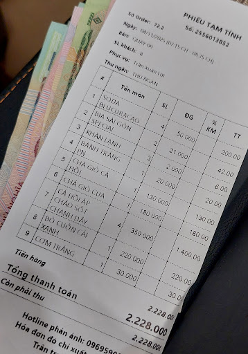 Read moreThe food is good and well done. We were sitting in the garden with an overhang and it was busy during this time. We got roasted sesame rice paper, spring rolls for 5, salmon with passion fruit sauce for 4 and one Bò Nướng Cuốn Cải (grilled beef in mustard greens) for about 2,2M VND or 80USD which makes this overpriced in comparison to other places.