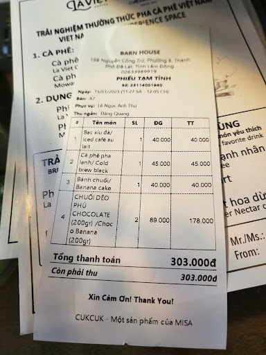 Read moreCompletely overrated and overpriced. I ordered a cold brew with milk. I received a glass that was maybe 2/5 coffee and 3/5 milk. It would be one thing if it was string like the Vietnamese drip coffee but it was not. It was just not good by any measure. I then ordered a vegetarian sandwich which said it came with grilled eggplant and cheddar cheese as well as tomato, cucumber, and lettuce. It also said it came with french fries. What I received was a sandwich with scamt amounts of lettuce, tomato and cucumber as well as a single sliver of beet root along with 6 french fries. When I told the staff that the sandwich was not as listed on the menu since it didn't have eggplant not cheese they seemed confused. I had to show them pictures of what an eggplant is from my phone. They kept telling me this is what I ordered and while I agreed that I ordered the sandwich it is not what they gave me. The whole experience was a frustrating waste of time. There are so many amazing coffee shops in Da Lat don't waste your time or money here. The space is beautiful and I appreciate the concept but they are seriously lacking...