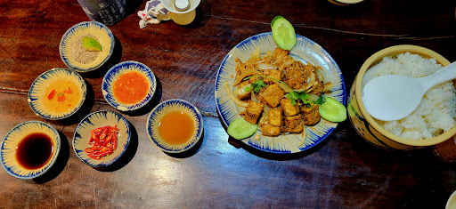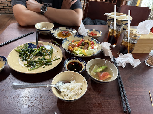Excellent dinner tonight at Quán Cơm Quê Xưa. The place is beautifully decorated for Tết and very cozy. We ordered the stir fried tofu with lemongrass, stif fried chayote leaves with garlic, honey grilled chicken, artichoke soup with pork ribs, and rose tea. Everything was cooked well and very tasty. We especially loved the tofu!