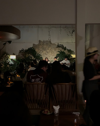 Không gian quán ấm cúng, đèn vàng dịu nhẹ, được decor với nhiều cây xanh và tường đá tạo cảm giác gần gũi như đang ngồi trong một góc phòng khách thân quen.