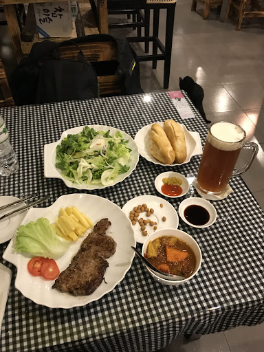 Wagyu steak was delicious. Tender and cooked medium rare. Garlic and butter were perfect additions. French fries were just right. We also ordered a green salad vinaigrette with avocado, onions and cucumbers. Very nice salad. The food was excellent and was the great redeeming value of the pub. The food was great, but the beer was not.