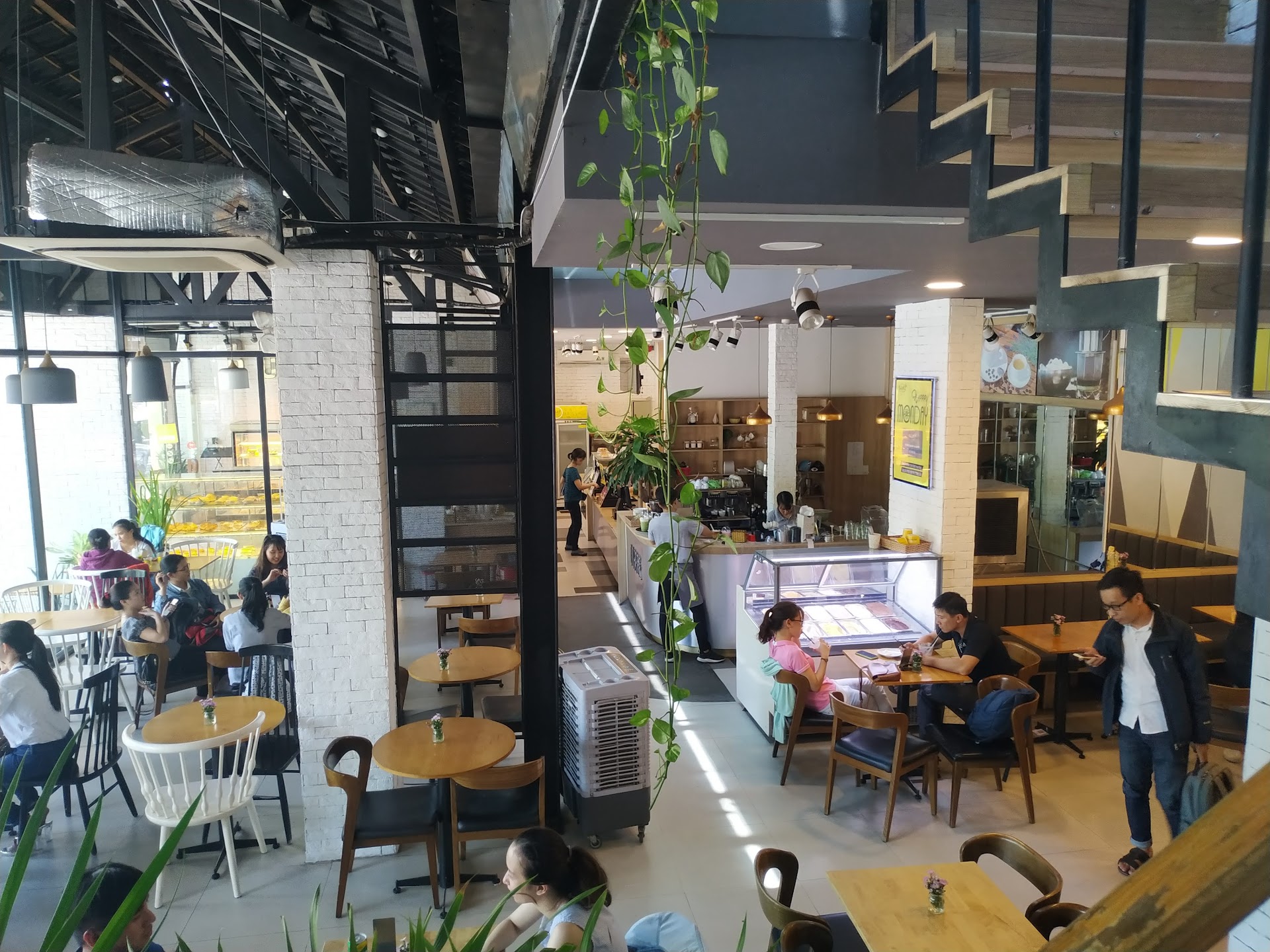 Summary: a good place for a non-private chat. Good pastries, and options for food (bread/burger). This is one of four Bon Pas in the city. Fresh coconut for the coffee. Water/tea self-service.