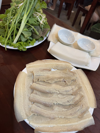 The pork is sliced just right—tender, with the perfect fat-to-meat ratio—and served with fresh herbs, crunchy vegetables, and soft yet sturdy bánh tráng (rice paper) that makes rolling each bite a hands-on, satisfying experience. Dip it into the rich, fermented mắm nêm, and every bite lights up with salty, sour, sweet, and spicy notes that dance on your tongue.