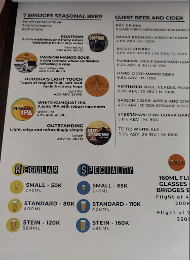 Read more✅ Highlights Excellent Selection of Award-Winning Craft Beers As part of the famous 7 Bridges Brewing Co. from Đà Nẵng, the taproom offers a wide range of styles — from hazy NEIPAs to stouts, sours, and pale ales.