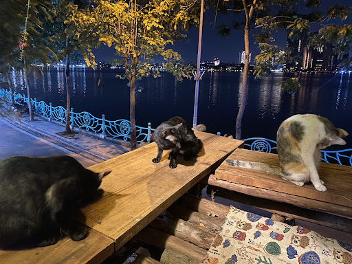 Read moreIt looked like an interesting building from the outside, overlooking the lake. You have to order at the counter which I did and then went upstairs. It looked a bit grim and the construction is of questionable safety. I sat down on the big bean bag and minutes later a big fat rat showed up and was nibbling on something on the pillar. I left immediately and sat on the little chair outside on the street where I saw another rat running across the carpet/bean bag area behind me. That's probably why there are so many cats running around. The coconut coffee was nothing special and...