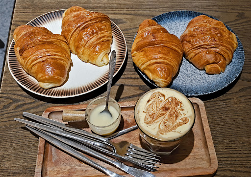 Siamo venuti in questo café un po' nascosto in una via secondaria per fare colazione, giusto per interrompere la routine vietnamita e tornare alle origini con caffè e brioche. L’atmosfera del locale è calma e raccolta, perfetta per staccare un po’ dal ritmo frenetico della città. Una musica discreta in sottofondo scalda l’ambiente senza mai farsi invadente, permettendo di conversare o leggere in tranquillità. Anche l’arredamento, semplice ed essenziale, contribuisce a questa sensazione di pace, con qualche dettaglio curioso come un piccolo acquario che aggiunge un tocco vivace di colore. Abbiamo ordinato un caffè all'uovo e un caffè al cocco. Premessa: il caffè è piuttosto robusto, potrebbe non piacere a tutti; nel caso, conviene chiedere di farlo un po' più leggero. Detto questo, il caffè all'uovo è SPETTACOLARE! La cremosità ed il sapore dell'uovo sbattuto, preparato al momento, sono ben equilibrati e si sposano ottimamente con il caffè sottostante. Il latte condensato viene servito a parte in un bicchierino, ma io golosamente l'ho subito aggiunto al duo uovo+caffè per ricreare il famoso triplo strato tipico di Hanoi. Il caffè al cocco è altrettanto buono: la crema soffice adagiata sul caffè è davvero sfiziosa. I croissant si presentano bene, riscaldati alla giusta temperatura nel fornetto; peccato per il sapore, che mi ha un po’ deluso. Anche il servizio segue il ritmo lento del locale: non è forse l’ideale per prendere un caffè di corsa, ma se si sceglie questo café ha senso concedersi tempo, lasciando stress e agitazione fuori dalla porta. In sintesi, è un posto molto carino, ideale per gustare un caffè in tranquillità, magari lavorando al computer grazie al WiFi e alle prese di corrente disponibili. Fateci un salto: per gli amanti del genere è sicuramente un luogo in cui fermarsi e rilassarsi. Ultra...