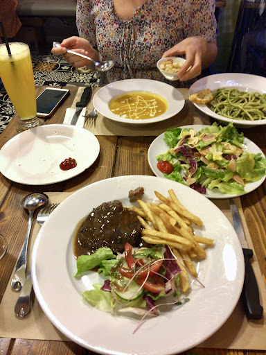 Không gian: quán nằm trên tầng 2 của một nhà cổ nên đẹp và yên tĩnh. Bài trí bàn ghế khá hợp lý. Cá nhân mình rất thích góc cửa sổ với dàn hoa tươi.. 2. Đồ ăn:. - Súp bí đỏ kem tươi: suất ăn đầy đặn nhưng mình kì vọng là kem tươi ngậy hơn chút, súp cũng hơi đặc quá.. - Salad nga: ăn ngon, thấy nhẹ nhàng chứ không bị cảm giác béo quá hay gặp ở loại salad này.. - Steak vai sốt rượu vang: vì steak là món chính nên mình cũng kì vọng và cũng may là đĩa của mình khá tốt với giá thành bình dân như thế. Miếng steak khoảng hơn 2 lạng, mình gọi medium rare thấy vừa vặn, ăn mềm. Chỉ tiếc là bên ngoài không hiểu sao có một góc hơi cháy chút.. - Gà nướng thảo mộc: lườn gà ướp mềm và thơm, moist chứ không bị khô.. - Mì fetuccine tôm với sốt kem nấm: mình khá thất vọng về món mì, tôm quá bé và sốt cũng không thực sự ngon. Mì cũng hơi vụn nữa. Nói chung không recommend món này.. 3. Giá cả: bọn mình đi 2 người tổng cộng là gần 700k cả đồ uống. Mình thấy giá này hợp lý cho một hàng steak, vì thực sự là đồ ăn nhiều. Nếu ăn mức trung bình các bạn chỉ cần khoảng 250k/người là ăn được rồi.. Tổng kết: sẽ quay lại nếu muốn tìm một không gian đẹp, yên bình cho một bữa đồ âu với giá cả hợp...