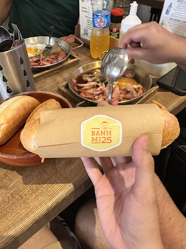 Read moreWe first went to Vietnam 🇻🇳 13 years ago. At the time, IG was a baby 🍼 and eSIM was not a thing for consumers. There, we had to use public computers at hotels to access the Internet. Plus reviews in Maps did not exist yet. So basically, finding a place to eat and choosing what to order was a matter of luck (of course, no translators either at the time! 😱). 😅 What I knew about Vietnamese 🇻🇳 food was what I could find in Sino-Vietnamese restaurants in France 🇫🇷, which are super common. But in these restaurants, there are no Banh mi. I guess selling baguette sandwiches in the country of baguette 🥖 wouldn't work... 😅 So I must confess the first time I ever heard about Banh mi was watching Somebody Feeds Phil, 2 or 3 years ago. And no, I did not realize Banh mi was a thing in the 10 days I spent in Vietnam in '12. 🤷 Few meters from our hotel, there's a place called Banh Mi 25, which used to be a couple of tables in the street and is now made of 3 different venues on both sides of the street. They serve Banh Mi, of course. And the star on their menu is a destructured banh mi: a casserole with all the ingredients of banh mi + bread on the side. That's what I ordered of course. And it was great! 🤩 Probably heavier than the sando 🥪 but richer and more tasteful too. I loved the casserole but, surprisingly, I loved the bread too. Being French 🇫🇷 I'm quite picky with bread. To me that was not a baguette but that was still very good. 👍 The service was nice, a bit slow maybe, and the vibes were cozier than in most restaurants in Hanoi 🇻🇳. We each had a banh mi + a drink and we paid VND700K... €4 per person! 🥳