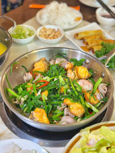 Ấn tượng đầu tiên là cá rất tươi – từng miếng cá lăng được áp chảo đến khi cháy cạnh nhẹ, bên ngoài vàng giòn nhưng bên trong vẫn giữ được độ mọng và ngọt tự nhiên. Mùi hành, thì là phi lên cùng mỡ cá thơm nức, chưa ăn đã thấy bụng réo rồi.