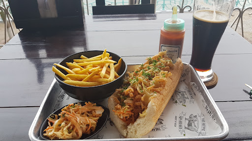 Suckling Sandwich with applesauce, crispy onions, and slaw.. Bread was decent, pork was smokey and packed good flavor, the crsipy onions were soft and room temp definitely made who knows when, the applesauce was not a fit and made the bread soggy, and the slaw was bland and overdressed...The sandwich should have had a tangy vinegar sauce to balance out the smoke flavor, and being i was the only one in the restaurant the onions should have been fresh and not battered, just a dry coating before frying..The fries served on the side were the best part; very hot, crisp, and salted perfectly..The slaw served on the side, bland and tasteless as well...The Coffee Porter beer was pretty good...