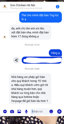 Read moreĐồ ăn ở đây khá là ngon, gà không bị quá ngấy và sốt đậm đà. Nhân viên phục vụ lúc đầu cũng thân thiện với bọn mình, nhưng sau đấy cách xử lý sự việc của các bạn nhân viên làm mình thất vọng. Mình ăn với bạn và còn thừa khoảng một đĩa gà, cả hai đồng ý nhờ bạn nhân viên đóng hộp cho bọn mình mang về, và bạn nhân viên ý đã rất nhanh nhẹn mang đĩa đi. Nhưng đợi tầm 15 phút vẫn không thấy bạn ý mang lại đồ cho bàn mình, mình đã nghĩ là đi ra cửa thì nhân viên sẽ đưa sau. Nhưng đến lúc mình hỏi các bạn nhân viên thì bạn nhân viên phụ trách đã đưa nhầm hộp đấy cho một khách hàng khác từ 15 phút trước đấy, và không có một ý định bồi thường tiền ăn của bọn mình. Các bạn ấy lấy lí do là đang đông khách nên mong mình thông cảm. Khi mình hỏi hoàn tiền vì chỗ đấy cũng phải được một đĩa đầy, thì bạn nhân viên không có ý định bồi thường mà chỉ xin lỗi (khá to) khiến mọi người xung quanh bắt đầu tập trung sự chú ý đến bọn mình. MÌnh xin phép đc rate phục vụ ở đây thiếu chuyên nghiệp, và hi vọng Donchicken rút kinh...