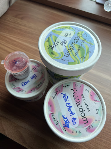 Freezdom is hands down one of the best ice cream places I’ve ever been to. The staff are amazing—super friendly, knowledgeable, and they really go out of their way to make sure you have the best experience. They even give you tips on how to pair the toppings with each flavor, which I thought was such a nice touch. The packaging is great too—not just well-done but also environmentally friendly, which is always a plus. Now, onto the ice cream! I tried a few flavors: Cóc (ambarella), mango and passion fruit, tào phớ (tofu pudding), and strawberry. They were all incredible, but Cóc absolutely stole the show. If you haven’t had it with ô mai salt, you’re missing out—it’s a total flavor explosion. The sourness of the cóc with the salt balances the sweetness perfectly and creates something truly next-level. Honestly, I’d give it an 11/10 if I could. The only downside? It’s seasonal, so I only got to have it twice. The staff recommended the mango and passion fruit flavor as a backup, and it was also really good—super creamy and refreshing. It doesn’t have the same tangy punch as Cóc, but I’d still rate it a solid 10/10. If you’re into tart flavors, the strawberry (dâu mật) is another great choice. The fresh jam they use with it is amazing—you can tell it’s made in-house—and it pairs perfectly with the ice cream. Every bite is just right. Overall, I can’t recommend Freezdom enough. The flavors are unique and delicious, the staff are wonderful, and they clearly care about quality and sustainability. Definitely...