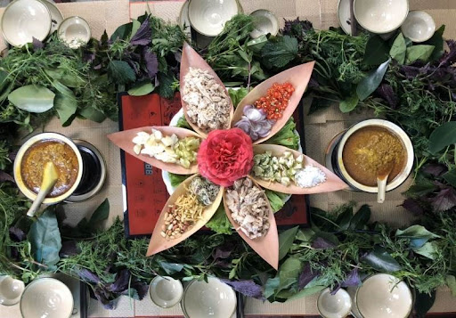Lần đầu mình ăn món này, đặc sản dân tộc vùng miền á, không có phổ biến lắm.. Ở đây sẽ có set với nồi cá được om với mắm thì phải chua chua đằm đằm, giữa là một bông hóa lớn các gia vị ăn cùng như hành, tỏi, ớt,... và bày trí xung quanh là nhiều thật nhiều các loại rau từ rau phổ biến như xà lách đến các rau rừng khó kiếm.. Có lẽ là mấy món này sẽ hợp với người lớn tuổi như ba ba đi nhậu đó. Món ăn khá hay và độc đáo, rất nên thử. Món này khi ăn sẽ lấy phần lá bọc thêm vơi một số gia vị mình thích và cá bên trong cùng, có thể bảo nhân viên gói cho ăn lần đầu nếu...