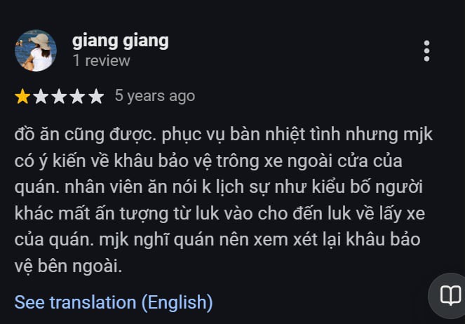Điểm trừ nhỏ có thể là vào những giờ cao điểm, quán rất đông khách nên đôi khi việc phục vụ có thể hơi chậm một chút. Tuy nhiên, nhìn chung, đội ngũ nhân viên thân thiện, nhiệt tình.