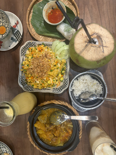 Grilled Pork served in bamboo tube (with steamed rice) (MUST TRY) Duck Curry (with steamed rice) Fried rice with pineapple and shrimp Summer rolls with shrimp and pork Fresh vegetable spring rolls Stir-fry water morning glory with pork Coconut Coffee Coconut (it comes in the coconut itself!) Banana and mango...