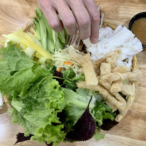 A pretty big shop selling only Nem nuong. It feels spacious and clean. Staff are friendly and fast in serving. The dip is thinner than some other restaurants but has a stronger peanut flavor and less garlic. The grilled meat is cold but we don’t mind it. It comes with a generous amount of vege esp mango and cucumber slices. It’d be perfect if the cucumber slices were treated with salt to get rid of...