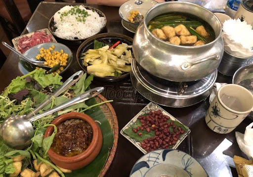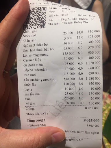 Về vấn đề đồ ăn: các bạn không hề hỏi thực khách có hài lòng về món ăn hay không, khi được phản ánh nước lẩu cua bỗng rượu chua quá thì cũng không có phản hồi gì. Điểm trừ của nhà hàng là không có giấy ăn khô cho thực khách, bắt buộc phải sử dụng khăn ướt và tính tiền. Đồ ăn thì giá thành rất đắt so với số lượng đưa ra, cụ thể: 1 đĩa gà chiên mắm khoảng 6-7 miếng (trong đó tính cả đầu gà được chặt thêm vào) giá 195k; lợn mường nướng khoảng 10 miếng cắt ô quân cờ nhỏ giá 155k; lẩu cua bỗng rượu 330k/nồi nhưng thêm đĩa sườn sụn là 110k (cho dù trước đó gọi điện trao đổi thì nhà hàng bảo có thể tính combo đó thành 410k, nhưng trên thực tế khi thanh toán vẫn là 440k/nồi lẩu).