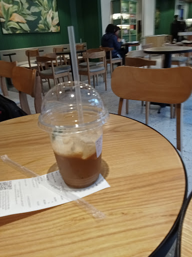 In a medium sized cup, they give you half a cup coffee..... Coffee was OK, but topped sweet. No napkins They served the chocolate croissant in a paper bag, and they knew I will have it there...all the chocolate and almonds stayed in the bag! So I payed for a relatively expensive croissant but got a deformed one in a bag with a 1/2 cup coffee, too sweet that i had to throw out most of it.....not very happy as you...