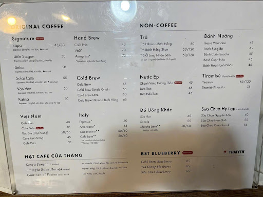 Thực đơn: Thực đơn của THAIYEN rất phong phú với nhiều loại đồ uống và món ăn nhẹ.
