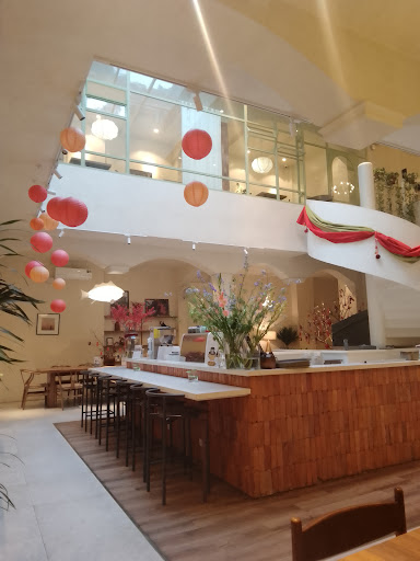 Part café, part furniture showroom, it feels like stepping into a beautifully curated lifestyle magazine. Think modern European charm with an Indochine twist. Soft pastels, natural wood, vintage ceramics, and lush potted plants give it this airy, almost dreamlike feel.