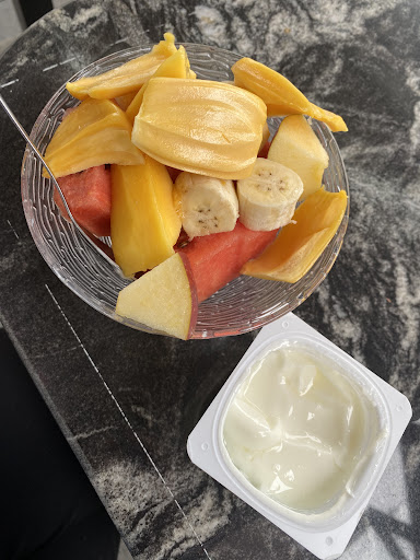 We also had banh mi, one with egg and one with tofu, which were both very hot (not spicy), and tasty. Also had a fruit salad (including jack fruit) with yogurt.