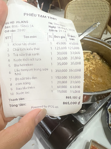 Read moreQuán mới mở thay cho quán ếch xanh. Menu gọi bằng quét mã QR. nhiều món tuy nhiên sắp xếp chưa hợp lý lắm. 1 số set đồ nằm mãi dưới sau đồ uống nên mình tưởng hết k gọi 😭 mình đi 2ng, gọi lẩu thái tomyum béo 380k, đĩa gỏi miến hải sản, cơm rang trái dứa. tổng bill tầm gần 600k. nước lẩu ngon, đồ nhúng hơi ít nhưng tươi. gỏi và cơm rang đều ngon. thích nhất là quán có trà sữa thái hehe. thêm vào địa điểm iu thích. gỏi hơi cay nha các bác. có...