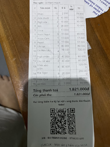 Read moreĐồ ăn bình thường, nước lẩu chán, tính hoá đơn còn bị sai cho khách. M k để ý hoá đơn ck song về nhà xem lại thì có ngô sữa 2 và ngô chiên 2 trong khi gọi 2 đĩa ngô chiên thôi, dưa hấu 2 đĩa k gọi nhân viên tự mang ra hỏi đk miễn phí à nhân viên gật đâu song vẫn tính vào hoá đơn(4 miếng dưa hấu 1 đĩa), khăn ướt dùng 4c nhưng...