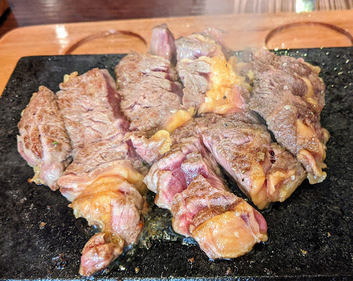 We were there for lunch. It was easy to find the restaurant because it was located in a main street of Hai Phong. We ordered steak and they had promotion "buy 1 get 1" . I can tell that it was not the best part of beef but it was ok. They cooked it on a hot rock which seemed to be cool however, it was in a room with no window, the AC was on, smoke was everywhere and we smelled just like beef. Sometimes, smoke from steak on rock was too much. We ordered 3 kinds of sauce, mushroom sauce was kind of tasteless, wine sauce with mint was salty, pepper sauce was the best one. Steak was ok, soft and juicy. We also ordered another set which we didn't like much. We thought that only steak was delicious. Steak in the set was dry , thin and a little bit hard. While rock steak was 250gr, steak in the set was 200gr and I thought it was from different kind of beef. Beef with mushroom was not tasty, and the worst part of it was mushrooms. Bread was crunchy and it was the...