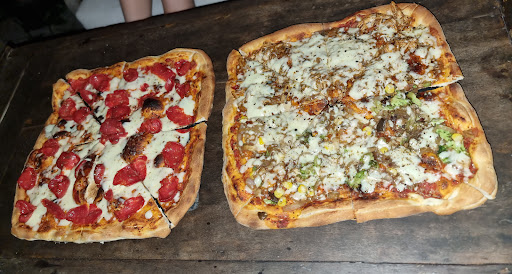We ordered a large chorizo pizza and a half vegetarian and half "Running Bird" pizza. The pizzas were excellent, with thin and crispy crusts. We also had a Whiskey Sour.