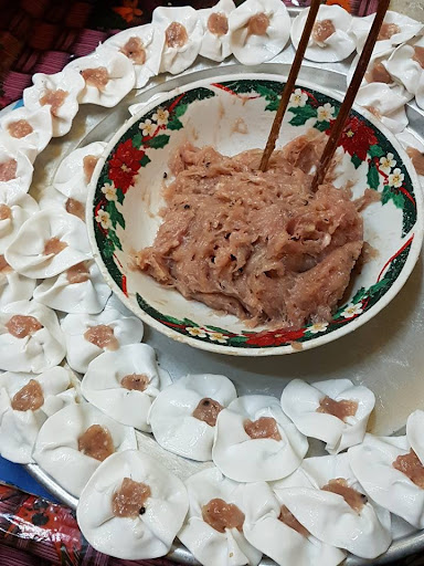 The dumplings are made from two small 2″ rounds of rice paper with a small spoonful of meat or shrimp filling in the center. When the rice paper is steamed, the edges get soft and chewy and warp a little, making the dumpling look like a white flower.
