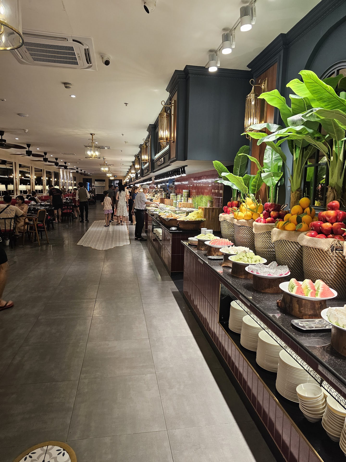 Đồ ăn ở mức xứng đáng với giá vé buffet mình trả. Rất nhiều sự lựa chọn từ món Á đến Âu, đồ Âu thì ăn không phải vị giống kiểu nguyên bản đồ ăn tây cho lắm nhưng vẫn ok. Và đặt biệt có cả các món nước Việt Nam như bún, phở, vv. Khẩu vị tùy quan điểm cá nhân đánh giá, còn theo mình ở mức ăn được. Nhân viên phục vụ rất nhiệt tình và lịch sự, luôn săn sàng hỗ trợ khách và dọn đĩa dùng rồi rất nhanh chóng để khách chọn món mới. Khẩu phần trưng bày ở đây cho cắc món ăn đảm bảo đủ để phục vụ khách hàng. Đây là điểm cộng rất lớn của nhà hàng đã liên tục châm thêm (top up) thức ăn khi gần hết. Việc này giúp nâng cao trải nghiệm khách hàng và tránh để tình trạng khách hàng trang giành đồ ăn hải sản như ở một số nhà hàng buffet khác ở Hà Nội.