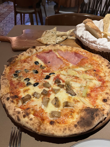 Their four seasons pizza is large enough for two people to share with an appetizer. Or order it all yourself and enjoy the leftovers! Quartered toppings are marinated artichoke hearts, black olives, marinated mushrooms and thinly sliced ham each over a light bed of marinara sauce and mozzarella cheese. The crust is thin but supports the toppings surprisingly well, with a pleasing bit of crunch to it and some chewiness. Baked in a serious pizza oven. Impeccable.