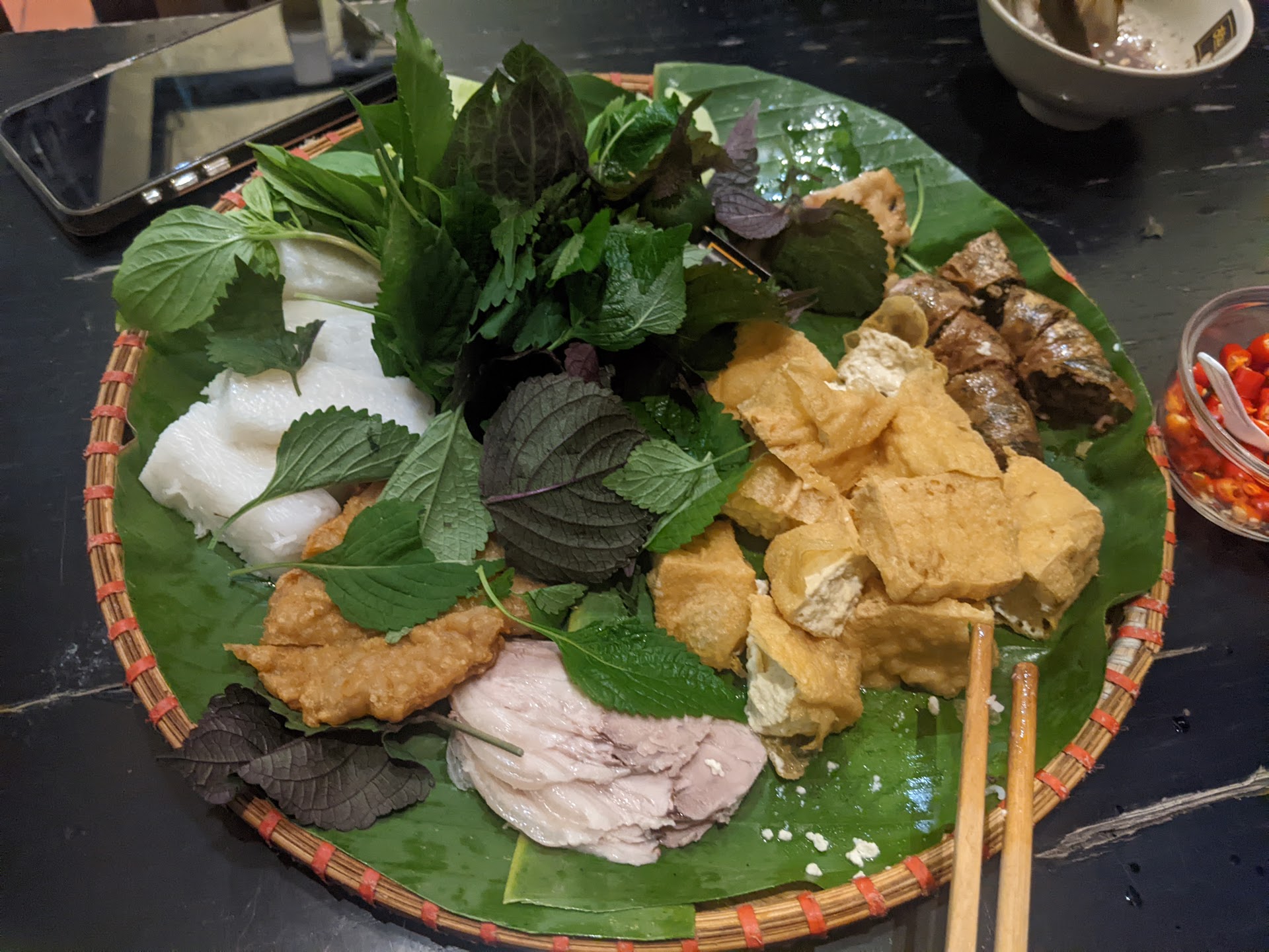 Mình gọi phần 169k cho 2 người + chả mực 35k, ok nha. No cành hông luôn á. Mắm tôm vẫn giữ chén nhỏ như vậy, nhưng cũng đủ chấm do mình không ăn mặn lắm. Cơ mà thêm 1-2 muỗng cafe chắc vừa ăn hơn. Do thiếu ít cũng ngại gọi phục vụ thêm chén mới.
