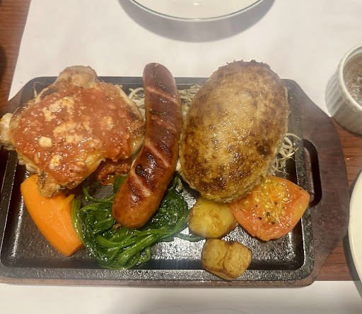 I recently visited this small, casual restaurant and enjoyed a hearty meal featuring a delicious mix of beef, sausage, chicken, and veggies served on a sizzling hot plate. The beef patty was perfectly cooked with a golden crust that sealed in the juices, giving each bite a rich, savory flavor. The sausage added a smoky aroma and had just the right snap, while the chicken was tender and topped with a tangy tomato sauce that brought depth to the meal. A side of fresh spinach, carrots, and juicy tomatoes added color and balance to the dish, making for a well-rounded dining experience.