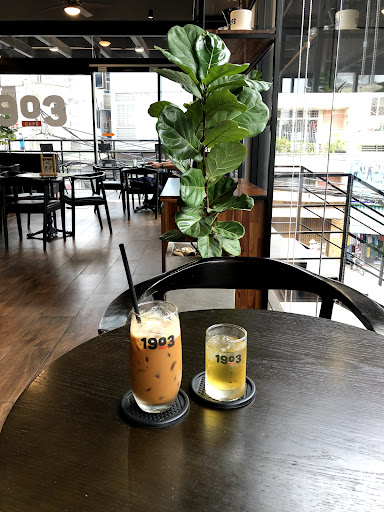 Read moreQuán cafe 1903 nằm trên đường Huỳnh- văn- bánh- gần ra tới đường nguyễn- văn- trỗi. Tiệm nhìn bên ngoài đã khá style với mấy chiếc xe moto bày ngày cửa, bên trong có cả 1 gara xe moto, có sửa chữa luôn hay sao ấy, có cửa tiệm bán mấy thứ liên quan như nón bảo hiểm, đệm bọc tay chân, bla bla. Đi cầu thang lên tầng trên là tiệm cafe, nhỏ thui, nhưng bày trí cùng style với cả khu, niềm đam mê mô tô của chủ tiệm chắc mạnh mẽ lắm đây hehe. Menu cũng nhiều món, tầm giá bình thường, tầm 35k - 60k, mình order trà đào và 1 trà đen machiato. 2 ly vị trà khá đậm, hơi đắng nhẹ ở ly trà đen, trà đào ổn hơn, hơi ngọt, lớp kem thì bình thường, hơi ngọt, không đặc biệt. Nhân viên nice, mình có gửi đồ ở tủ lạnh của quán thì lúc đi ra hoàn toàn quên nhân viên vẫn nhớ để chạy theo nhắc...