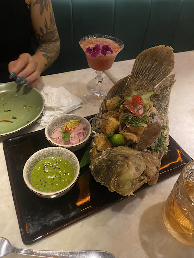 We ordered the following dishes: Salmon Waffle - consisting of a Banh Nhung waffle tart, smoked salmon, crème fraiche, salmon roe. The waffle tart was delicate with a lovely crunch. The smoked salmon and crème fraiche combined beautifully for a balanced, creamy, smoky salmon flavour hit, broken up by little explosions of salmon hits from the salmon roe. Hà Nội Tumeric Fish - perfectly cooked Black Cod sitting on top of a flavoursome tumeric foam with hints of dill, garnished with a bun noodle on the side. The Black cod literally melted in our mouths, the tumeric foam was not overpowering and just complimented the fish and the bun noodle and dill cracker provided a variety of different textures. A wonderful experience and arguably our favourite dish of the evening, noting that every dish we had was a winner. Seafood spring roll - Crispy spring roll with crab, shrimp and pork, fresh herbs, Nuoc Cham sauce. A beautifully executed spring roll. The filling was tasty, soft and flavourful, surrounded by a delicate, flaky, crispy skin. Once again, different textures combined beautifully for arguably one of the loveliest, high end spring rolls I have ever eaten. Crab Fried Rice - Camau crab, shrimp, pork, spring onion, garlic, onsen egg. Served in a claypot with the ingredients proudly displayed, the first thing to do is mix it all up. There were just so many flavours and textures to enjoy. The softness of the crab meat, firmness of the pork Chinese sausage with bits of crunchiness mixed in for good measure. Grilled Squid - Chargrilled squid served with mango cucumber salad, green herb chilli sauce. Not sure how they did it but the squid had a wonderful char flavour while at the same time had a melt in the mouth texture. How they managed to do this with squid is beyond me. No rubber texture here. Roast Duck Street Style Pizza - Confit Mekong duck, mozzarella, fresh herbs, tamarind and hoisin sauce, grilled rice paper. Take the best Peking duck pancake that you have ever eaten and multiply it by a wow factor of 10. The duck was so tender and full of flavour. The herbs were well balanced and worked in harmony with the duck meat. The sliced cucumber provided bursts of freshness. But what I really loved was the grilled rice paper “pizza base” that while so delicate that you would think it would shatter if you breathed on it, was more than up for the task of supporting the delicious pizza payload. And upon biting into it the crunch was oh so satisfying. Along with the Hà Nội Tumeric Fish, this was my favourite dish of the night. Fish sauce ice cream - Vanilla, fish sauce caramel, Phu Quoc pepper, Nuoc Mam perfume. The vanilla bean ice cream was so creamy and the fish sauce caramel was an interesting and delicious take on classic salted caramel. The Nuoc Mam perfume in its own perfume bottle was a a very nice touch but my recommendation is to spray your dessert sparingly as it is quite strong and fragrant. Young coconut caviar - Young coconut ice cream, Dakar Caviar. The coconut ice cream provided a sweet creamy flavour contrasted by the saltiness of the caviar. The small mint leaves provided a strong punch of minty flavour.