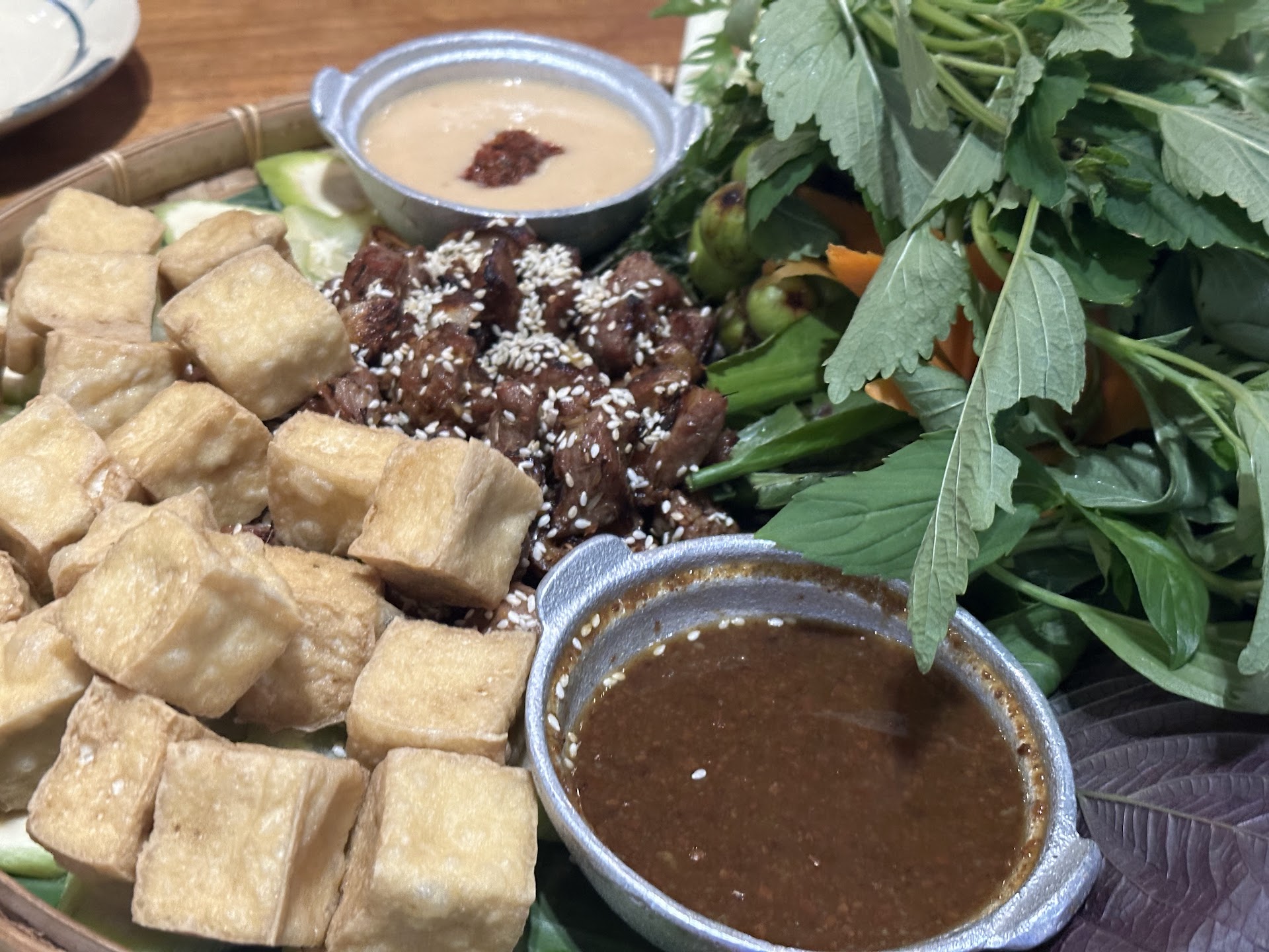 But what made us more uncomfortable was the staff. Almost no communication at all from the one who served our table. She looked unhappy since beginning, was standing there waiting for us to order shortly after giving us the menus with lots of items, then came back when we hadn’t been ready and just left again when we were in the middle of ordering and literally just discussing the last dish to order. And a bit later when she came back to give the default side snacks (crunchy rice paper & peanuts I think), it felt like she basically threw it on the table. Also not a big deal, but worth noting they charge for these though it might feel like they are giving it as complementary items from the restaurant.