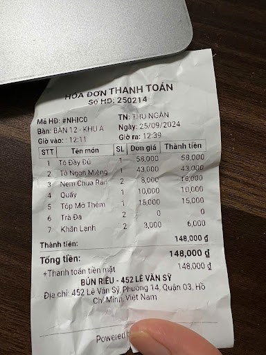 Read moreGhé ăn lúc hơn 10h tối, trong quán ngoài mình thì chỉ có 2 khách nữa là 3 người. Gọi 1 tô bún đầy đủ mà chờ gần 15p mới bưng ra, xong mình nói rau trụng (bàn 2 khách kia cũng kêu rau trụng). Đợi thêm 1 buổi nữa ko thấy rau, mình nhắc lại, thì mới lo làm, trụng rau thôi nhưng cũng rất lâu, đem ra ko 1 lời xin lỗi. Bàn khách kia cũng quạu giống mình kêu "rồi rau bàn này đâu em, anh ăn sắp hết bún luôn rồi chưa có rau". Quán 3 4 nhân viên, ko biết làm cái gì. Nói chung dịch vụ rất tệ. Món ăn thì bình thường, 1 tô đầy đủ 61k có 4 5 miếng bò tái, 1 cây chả nhỏ, 5 6 cục tàu hủ chiên, với riêu cua (mà nó rã rời trong nước), trà đá 4k Không bao...