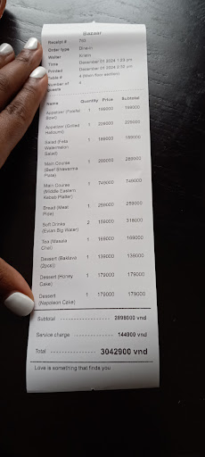 I just had a great experience at Bazaar. The food here is truly Turkish with rich flavors, especially dishes like kebab and baklava. The grilled meat is very tender and fragrant, combined with traditional spices and sauces, creating great harmony. The mezze section is diverse and rich, well worth a try!
