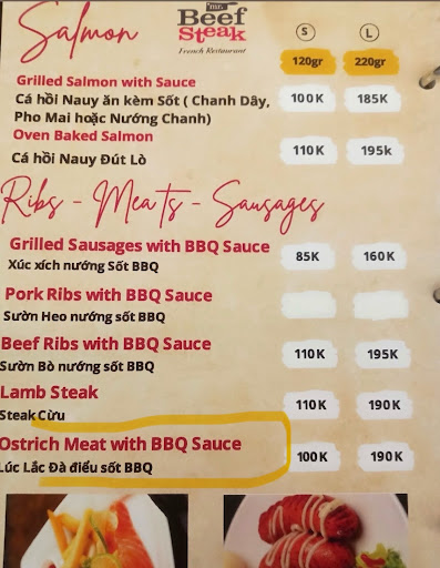 We ordered the "ostrich" meat and got completely mystery meat. I am familiar with ostrich, it's a red colour when cooked. The meat they serve us is light. It doesn't even taste or smell like chicken and has a weird texture, so what meat did they really serve? We called the waitress and asked to disclose which meat it is - she insisted it's ostrich. Ostrich is in NO way anything else but red/brown when cooked.